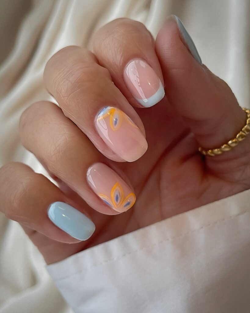 This delicate manicure mixes sheer nude, crisp white tips, and a single soft baby blue accent for a fresh, feminine finish. The tiny floral detail in warm yellow and orange adds a playful twist without overwhelming the look. It’s the perfect idea for Pinterest lovers who want something minimal, pretty, and easy to wear from spring brunches to late-summer days.