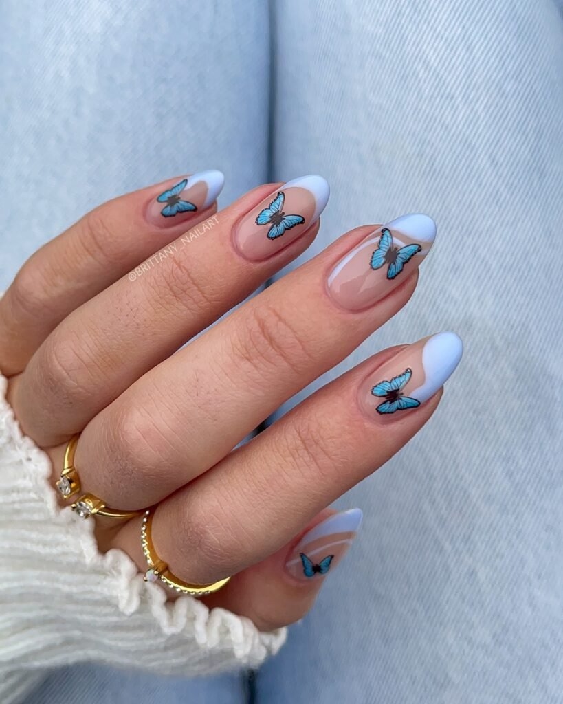 Butterfly nail art instantly gives any manicure a sweet, feminine feel, and this baby blue version is especially charming. The mix of sheer nude, white tips, and bright blue butterflies creates a fresh and airy look. It’s playful, polished, and perfect for springtime inspiration. Save this design if you love soft nails with a whimsical Pinterest twist.