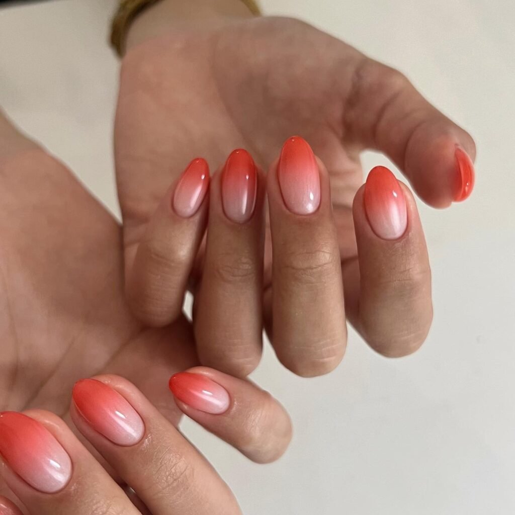 If you love simple spring break nails, this coral ombré manicure is the definition of effortless beauty. The glossy gradient blends soft nude with juicy orange-red tones, making it ideal for vacation nails, sunset-inspired looks, and minimalist Pinterest aesthetics. It works beautifully on short to medium almond shapes and gives you a clean, fresh manicure that feels trendy, wearable, and perfect for spring or early summer.