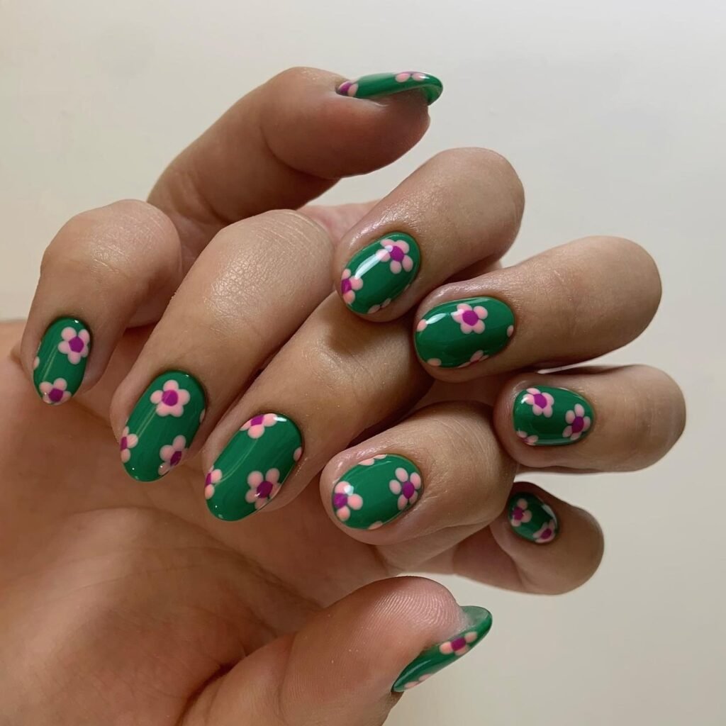 Green floral nails are having a major moment, and this short manicure proves why. The rich green base paired with tiny pink flowers feels retro, cheerful, and easy to wear, making it perfect for Pinterest users who love cute short nail ideas. This design is low-maintenance but still eye-catching, so it works beautifully for everyday spring outfits, garden parties, weekend plans, and simple flower nail inspiration.