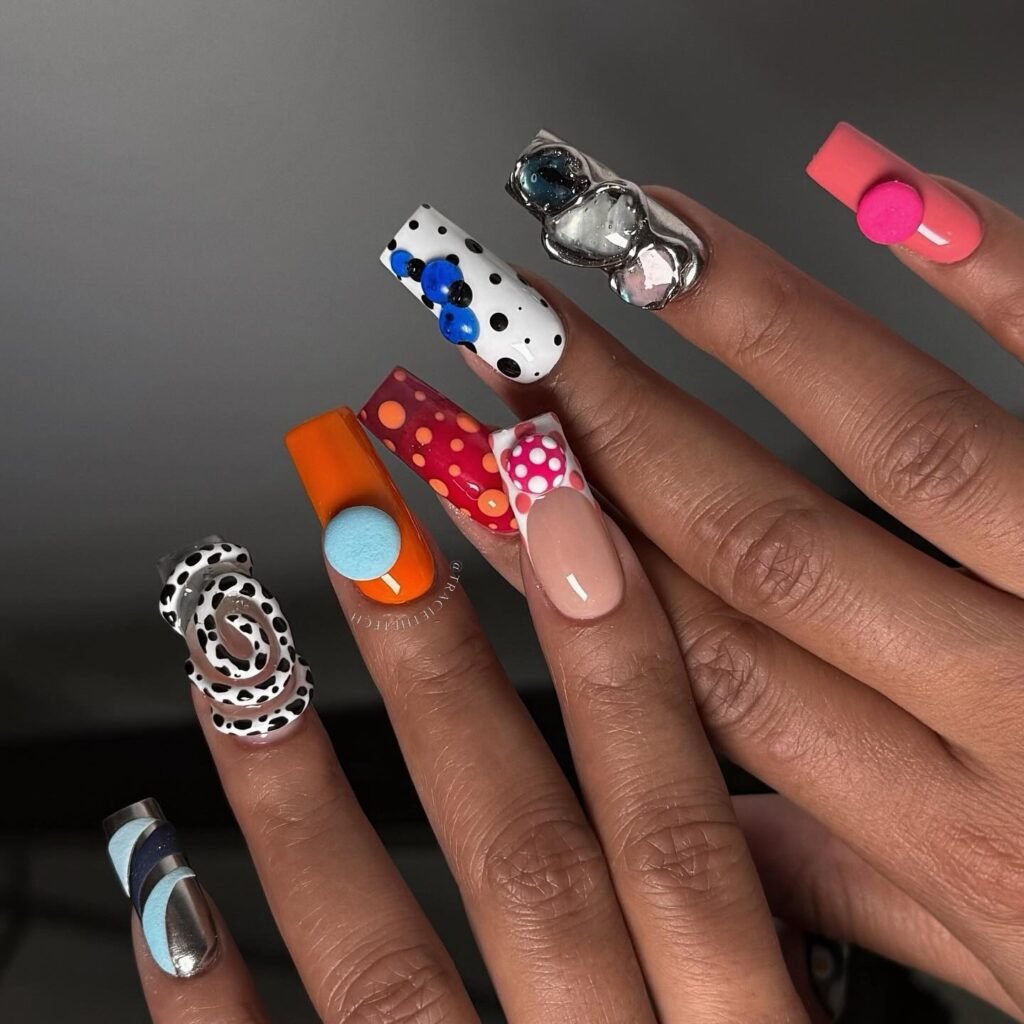 Playful, graphic, and fashion-forward, this bold mixed-design manicure is made for trend lovers who want their nails to start conversations. From bright color blocking and polka dots to chrome accents and 3D details, every nail feels like a mini art piece. This is the ultimate Pinterest inspo for anyone craving funky acrylic nails, creative spring break looks, or statement nail art that turns every outfit into a moment.