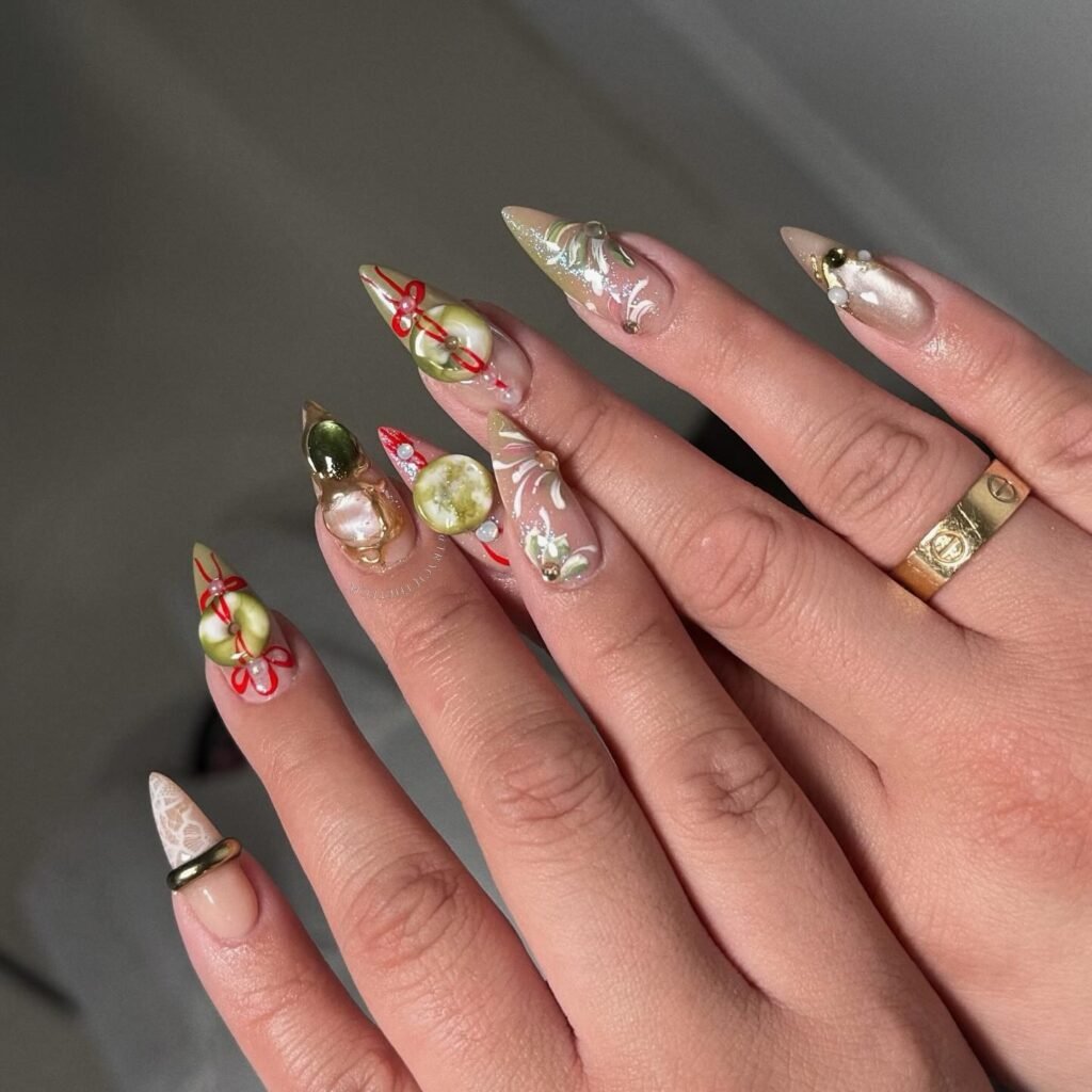 These elevated olive and pearl nails bring a luxury twist to spring break nail ideas. The 3D textures, glossy accents, delicate art, and soft neutral base make this manicure feel like wearable jewelry. Perfect for Pinterest users who love high-end nail designs, this look combines elegance with creativity and works beautifully for special occasions, vacation dinners, or anyone wanting sophisticated statement nails with an artistic finish.