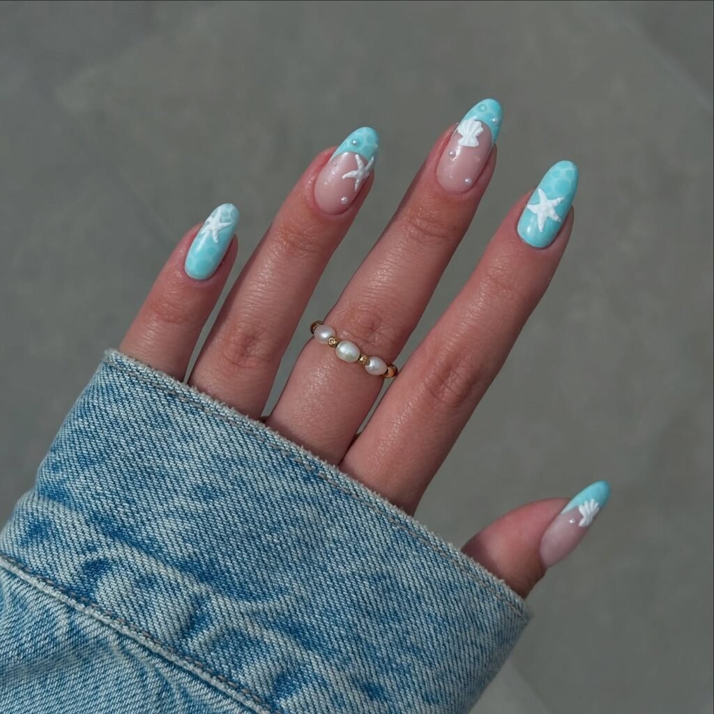 These dreamy ocean-blue spring break nails are perfect for beach vacations, coastal getaways, and tropical Pinterest mood boards. The soft aqua shade, seashell accents, pearl details, and tiny starfish create a fresh mermaid-inspired manicure that feels playful yet elegant. If you want cute beach nails that still look polished, this design is a beautiful choice for almond nails, vacation photos, and warm-weather nail inspo.