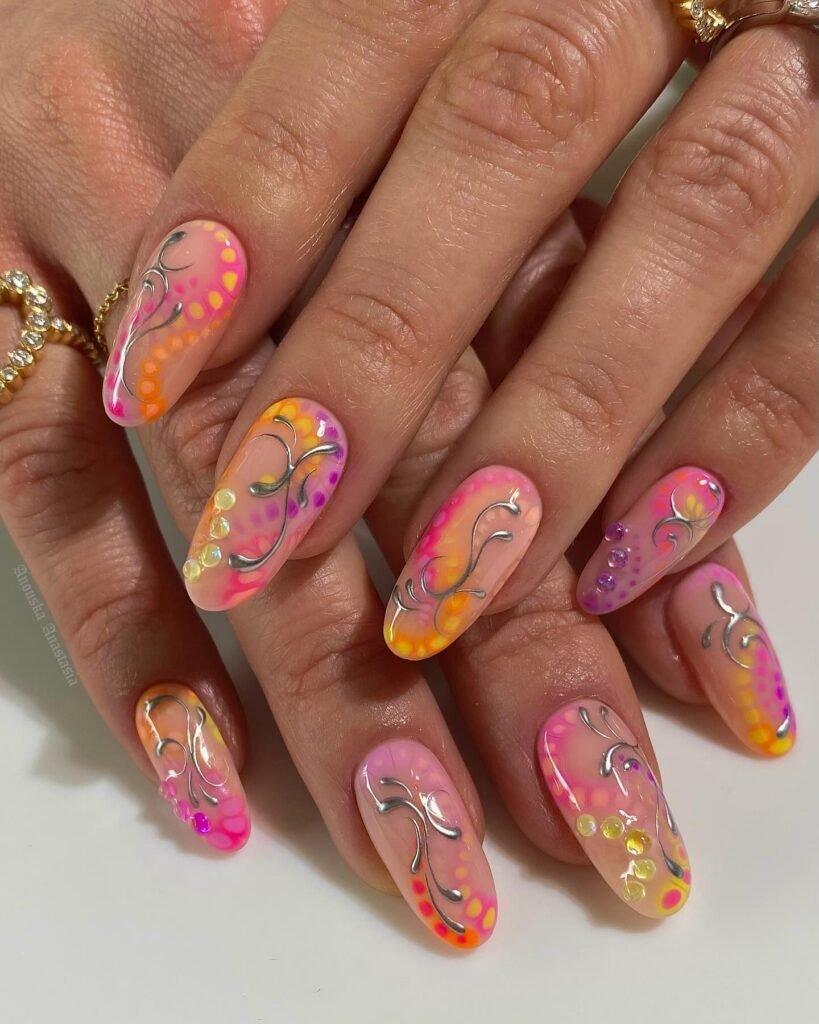 Bright, artistic, and impossible to ignore, these abstract neon nails are made for bold spring break energy. The mix of pink, orange, yellow, silver swirls, and gem accents creates a statement manicure that stands out in every Pinterest feed. If you love colorful nail designs with a creative edge, this look is perfect for festivals, vacations, and trendsetters who want playful acrylic nails with a major personality.