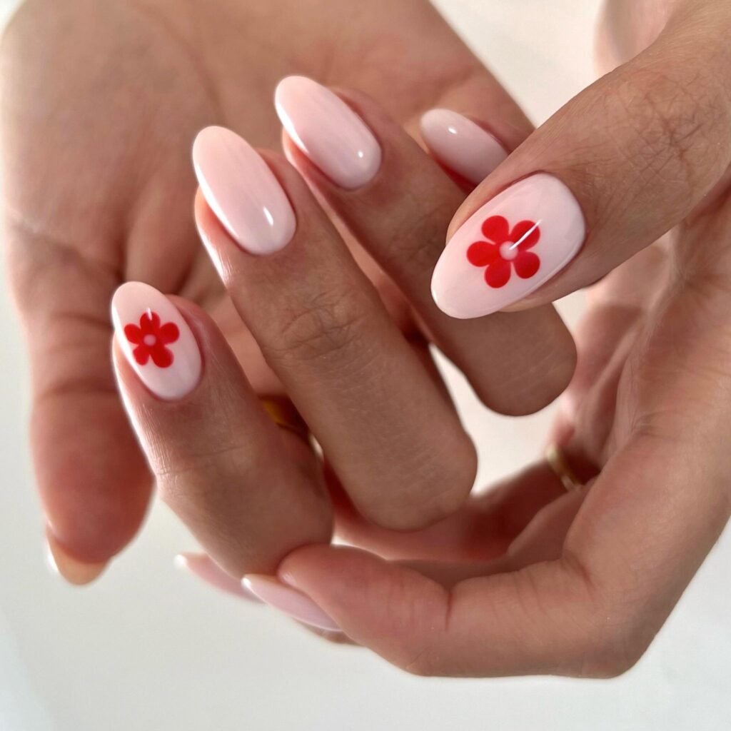 Soft pink nails with tiny red flower accents are a timeless pick for cute spring nail ideas. This manicure has a sweet, feminine look that feels romantic without being too bold, which makes it perfect for Pinterest users who love clean floral designs. The glossy finish and simple daisy-style art create an easy everyday manicure that also works beautifully for brunch dates, spring break trips, and fresh seasonal nail inspo.