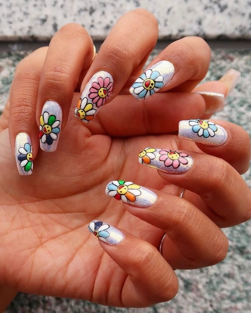 These holographic daisy nails are fun, nostalgic, and perfect for anyone who loves playful Pinterest beauty trends. The shimmering base adds a dreamy glow, while the colorful smiley flowers bring a cheerful Y2K-inspired touch that instantly stands out. If you are searching for cute spring break nails, happy nail art, or festival-ready manicure ideas, this design delivers bright personality and photo-ready charm in the sweetest way.