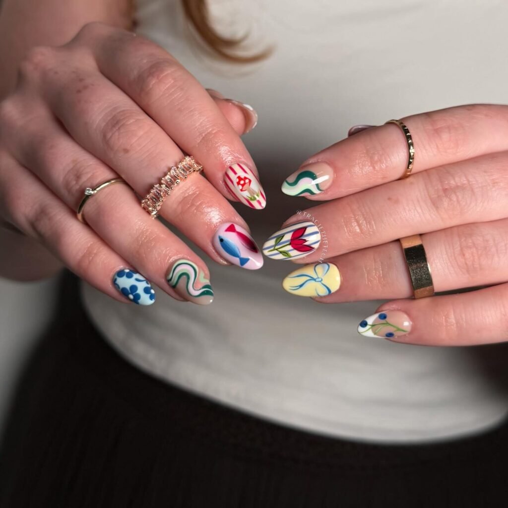 If you love eclectic nail art, this mismatched spring manicure is pure Pinterest gold. Each nail tells a different story with wavy lines, florals, stripes, and playful color blocking, creating a curated look that feels artistic and modern. This design is perfect for anyone who wants unique spring break nails without choosing just one style, and it works especially well for fashion lovers who adore creative, editorial-inspired manicures.