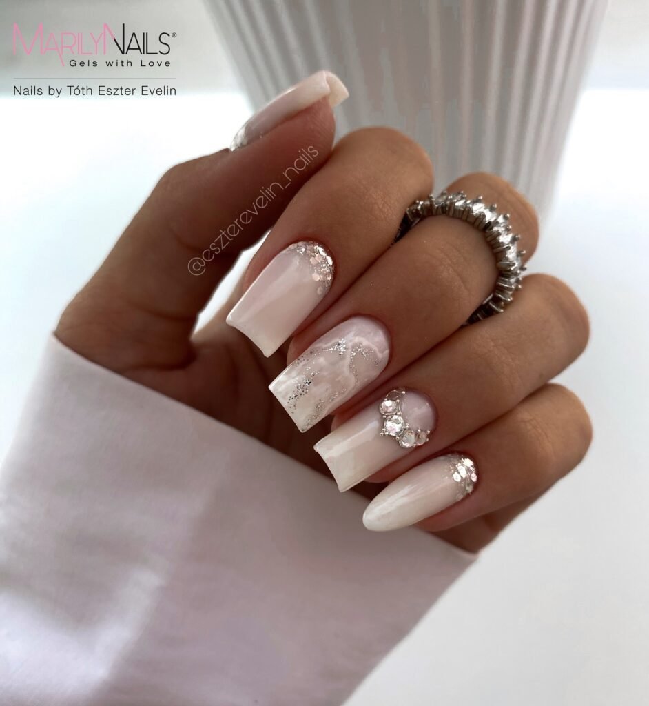 Upgrade the classic by pairing a **milky jelly base** with subtle glitter specks and a single statement gem. This design stays spring-appropriate because the color stays soft and translucent, while the sparkle adds that “special occasion” glow. Ask your nail tech for a sheer white/milky overlay and finish with a **high-shine top gel** for the jelly look.