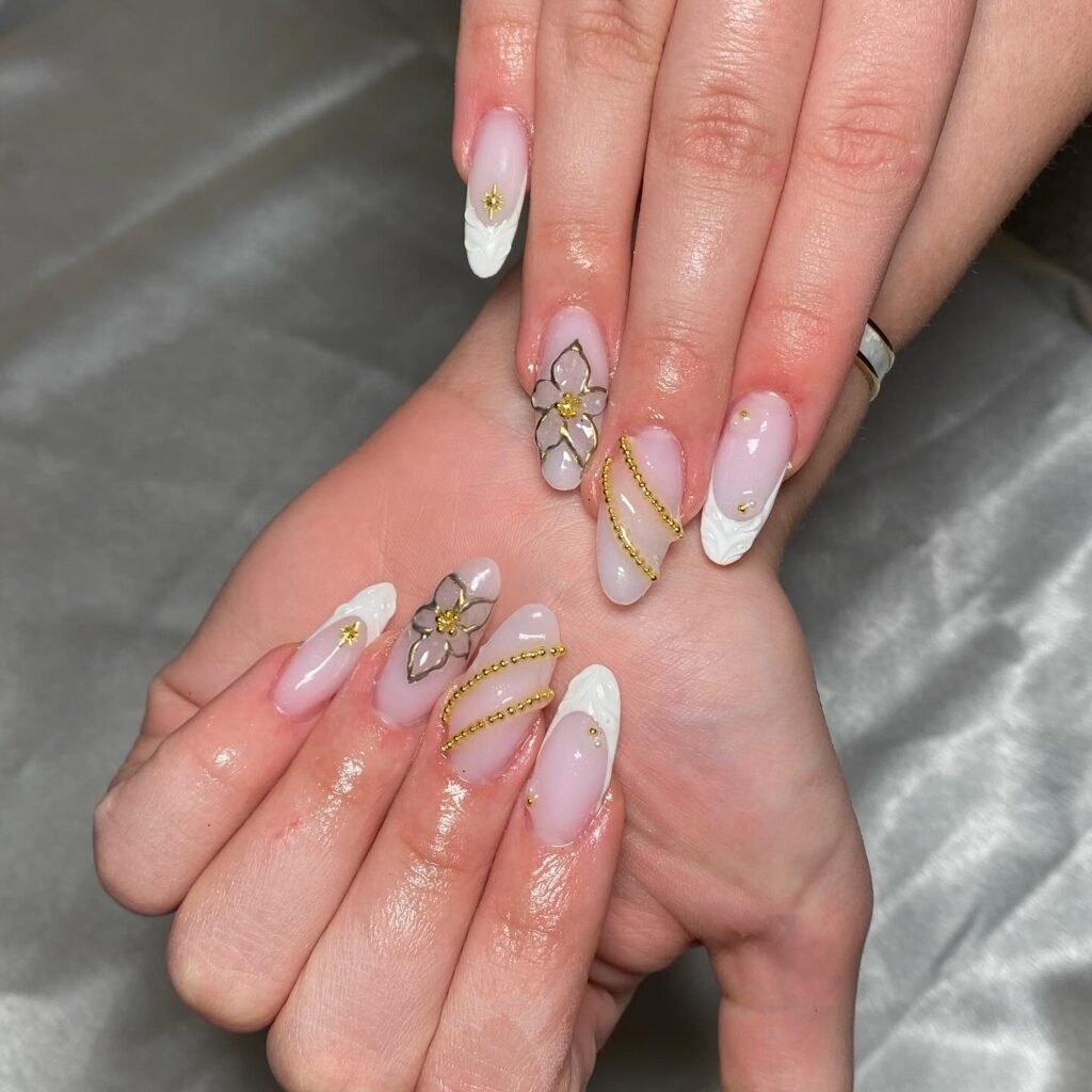 Milky White Base + 3D Flower Detail with Gold Accents