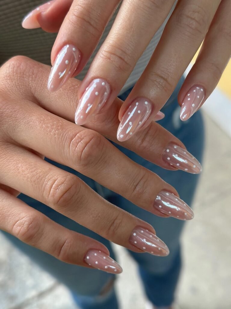 This version makes spring feel playful: a sheer milky pink base topped with **white dot details** that look like little raindrops or floating pearls. The jelly-glazed top is what makes it pop—without looking thick or bulky. Try this if you want something easy to wear daily but still cute enough to save for your next Pinterest nail appointment.