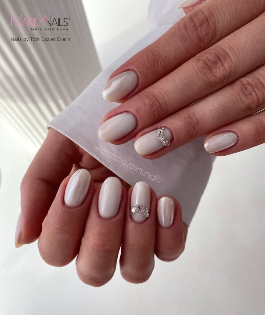 If you’re after a clean, bridal-friendly spring milky manicure, this is the one. The nails are a soft milky white with a glossy finish, plus a single rhinestone cluster accent for luxe shine. Because the color is neutral and translucent, this style pairs beautifully with rings, pearls, and any outfit—without overpowering your look.