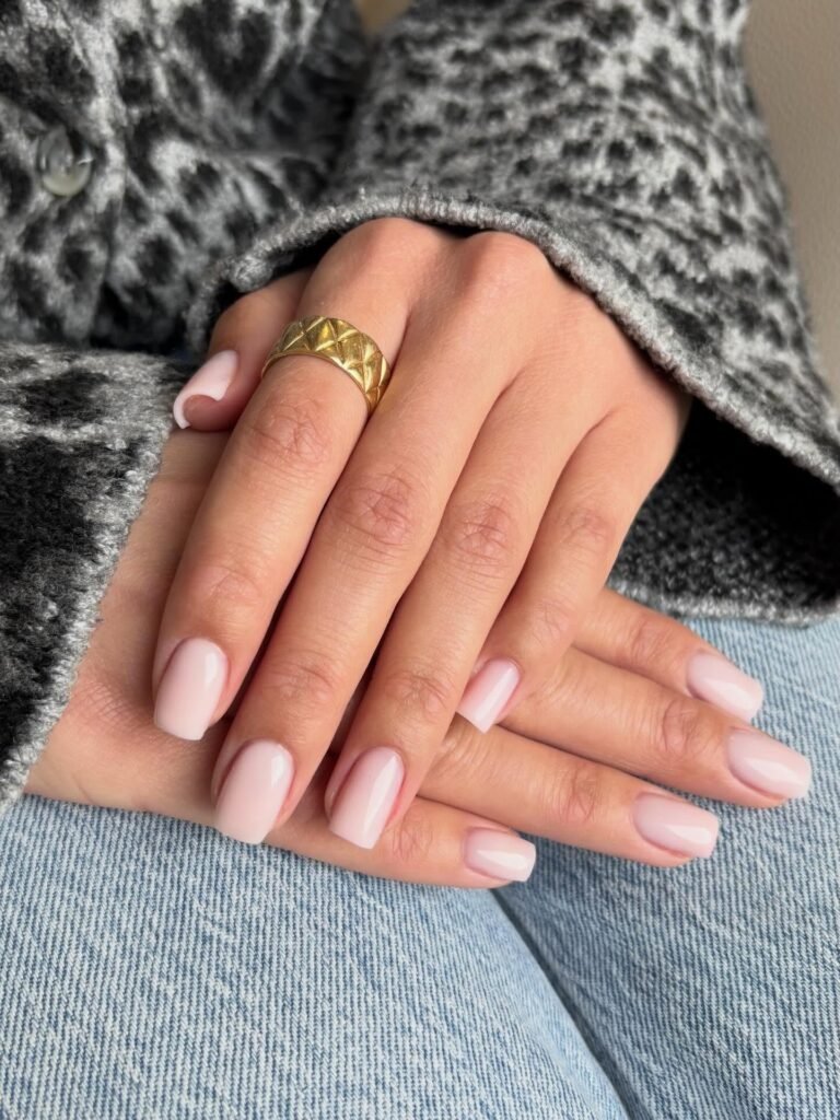 This one is the “always works” milky shade—light, creamy, and glossy with a smooth jelly finish. It’s the kind of manicure that makes your hands look fresh even when you don’t want nail art. If you’re building a spring nail wardrobe, save this as your neutral go-to: it matches casual denim days and dressy outfits equally well.