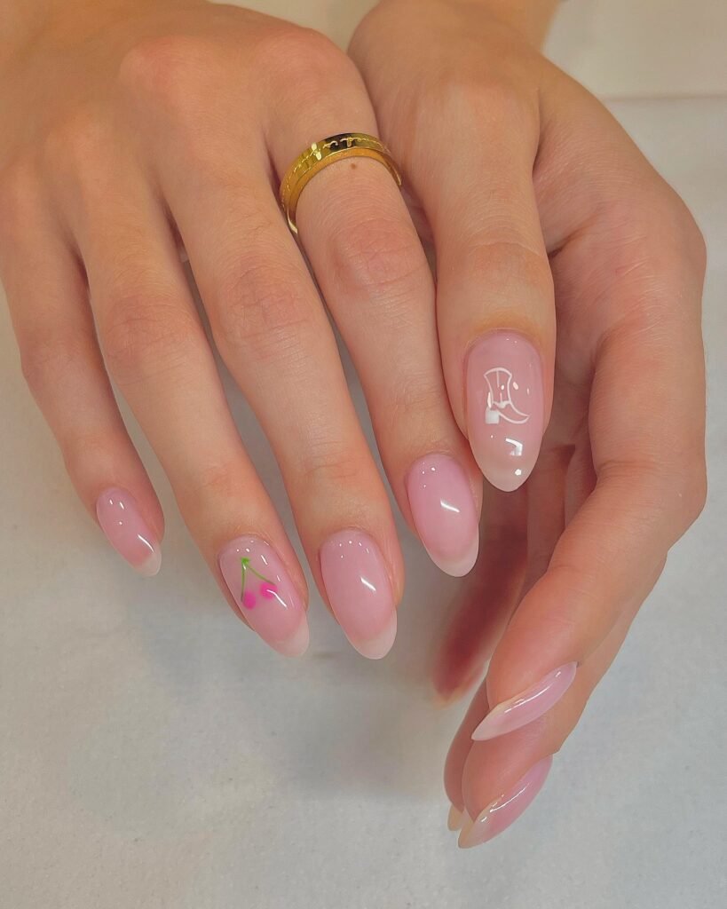 For spring lovers who want nail art without heavy coverage, this milky jelly manicure nails idea is perfect. The base stays creamy and translucent, while the tiny pink accents (mini blossoms + soft lines) give a fresh “garden sketch” vibe. Keep the artwork scattered and light for that airy spring feeling—and seal everything with a glossy top coat.