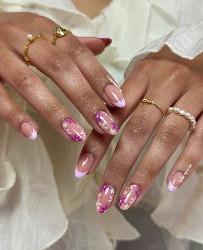 Go full spring garden with this lilac glaze set. The milky base keeps everything airy, while violet petals and tiny white blossoms bring that fresh-bloom vibe. Yellow-gold centers add a warm pop that still feels soft, not loud. Try it with almond or short-to-medium nails for an effortless brunch-to-garden look—perfect for Pinterest Spring Nails You’ll Love boards. Finish with a glossy top coat for extra glow in daylight.
