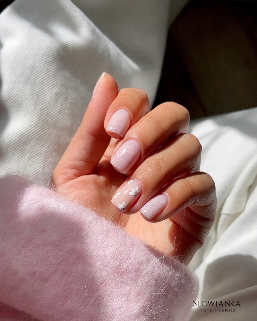 Blush Glitter Spring Nails with Mini White Flower Accents