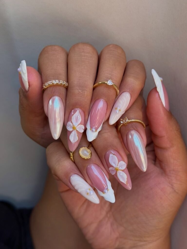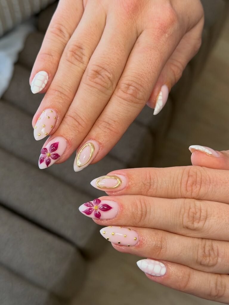 Bring romantic garden energy with this white-and-blush set. Several nails feature sheer pink with glossy petals, while others go for a crisp milky white that brightens your look instantly. The gold details—arched rings and tiny bead accents—add a luxe finish without overpowering the soft florals. It’s ideal if you love spring nails that feel elevated, like bridal or graduation-ready nail art.