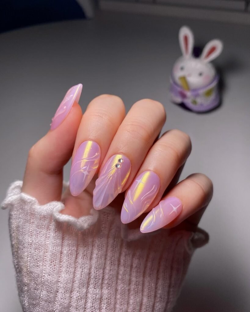 Jelly-gel meets spring magic in this dreamy chrome look. The base is a soft, translucent lilac-pink, then gold foil lines and mini gems add a sunlit “aurora” effect. Each nail has a slightly different shimmer direction, so the set looks custom and photo-ready from every angle. This is a perfect choice for anyone who wants spring nails that are feminine but still trendy and glossy.