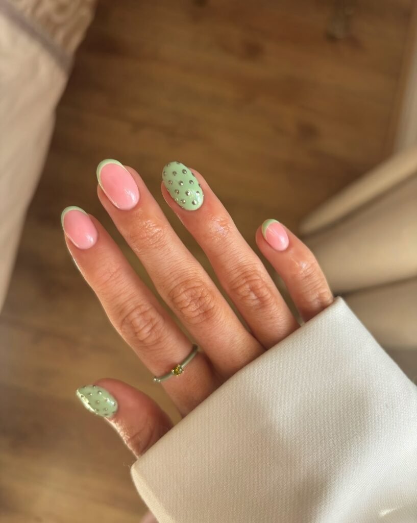 Playful and fresh, this manicure is all about color blocking with tiny texture. Most nails are sheer pink, while the accent nails switch to a mint-green cap topped with small gold dot studs. The contrast feels summery yet refined, especially with a glossy top coat that makes the dots pop. If you want subtle spring nail art, keep it to 1–2 statement nails.