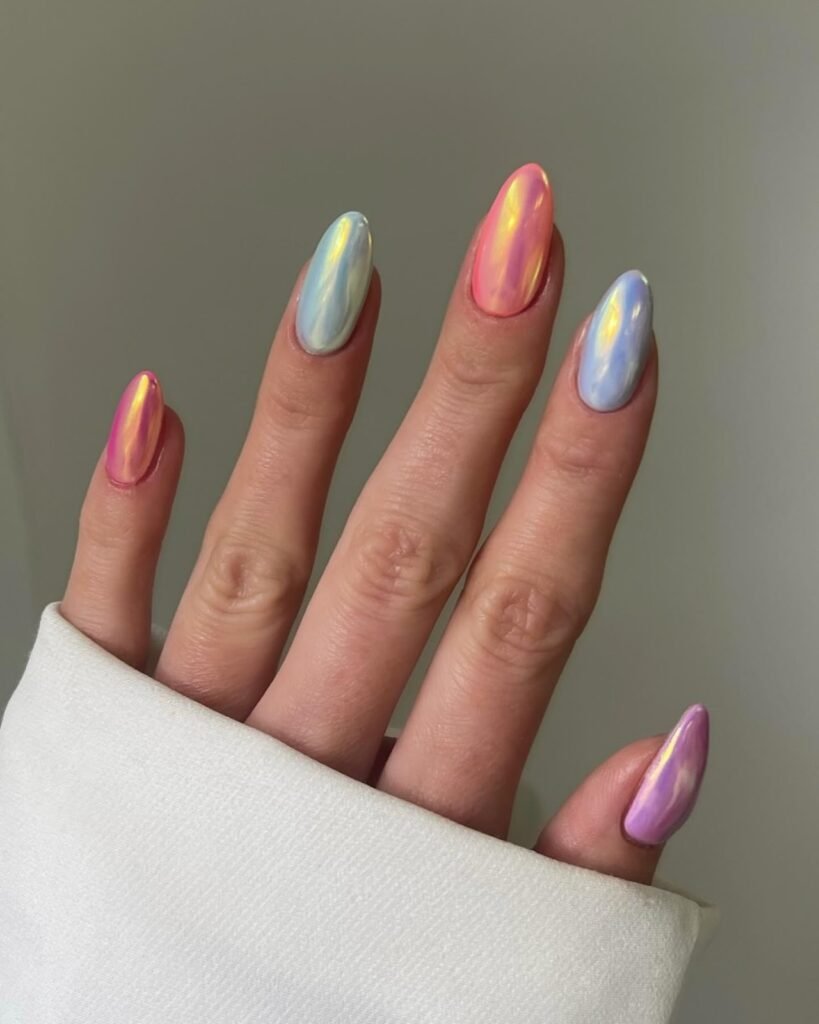 This final design brings pure spring energy. Each nail is coated in an iridescent chrome that shifts from icy blue to pink to gold as you move your hand. The smooth almond shape keeps it elegant, and the neutral skin tone makes the rainbow glow look vivid. Want a bold spring update with minimal effort? Save this “one manicure, all occasions” look.