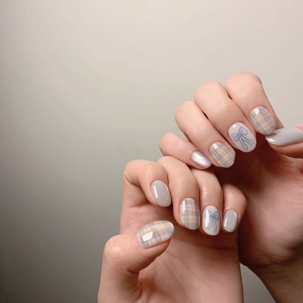 This soft neutral manicure pairs plaid patterns with simple bows for a sweet, preppy finish. The muted gray and beige tones make the design feel calm and wearable, while the detailed accents add just enough charm. If you love spring nails that are understated, polished, and a little whimsical, this look belongs on your mood board for easy saving today.