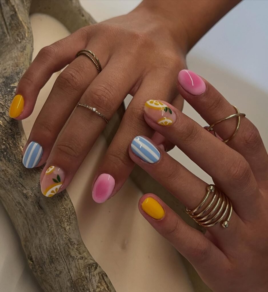 These spring stripes nails mix cheerful yellow, baby blue, and soft pink for a look that feels fresh and Pinterest-perfect. The lemon-inspired accent art adds a playful twist, while the glossy finish keeps everything polished. If you love manicure ideas that feel bright without being loud, this set is a beautiful way to welcome warmer days and save as easy spring nail inspo.