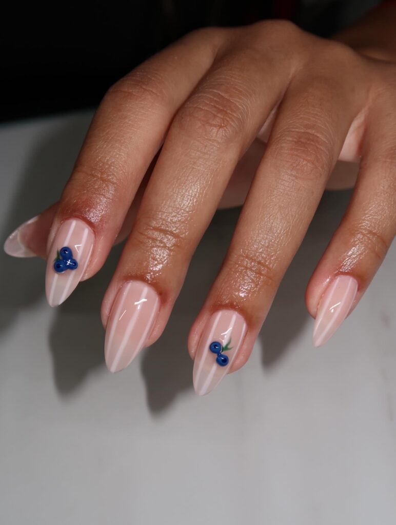 This sheer pink manicure with tiny blue berry accents feels delicate, clean, and unexpectedly charming. The almond shape keeps it elegant, while the little details add just enough personality to make it memorable. It is a beautiful choice for anyone who loves minimal nail art with a fresh spring twist and a polished everyday finish and saves well on Pinterest.