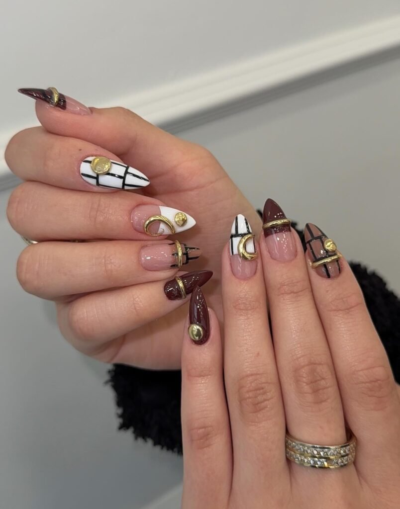 This mixed-pattern manicure brings together neutral plaid, crisp black lines, rich burgundy, and gold hardware for a polished editorial feel. The combination looks modern and artistic without losing wearability. If you enjoy spring nails that lean more sophisticated than sweet, this design offers a stylish balance of structure, shine, and subtle drama for everyday elegance and Pinterest appeal too, today.
