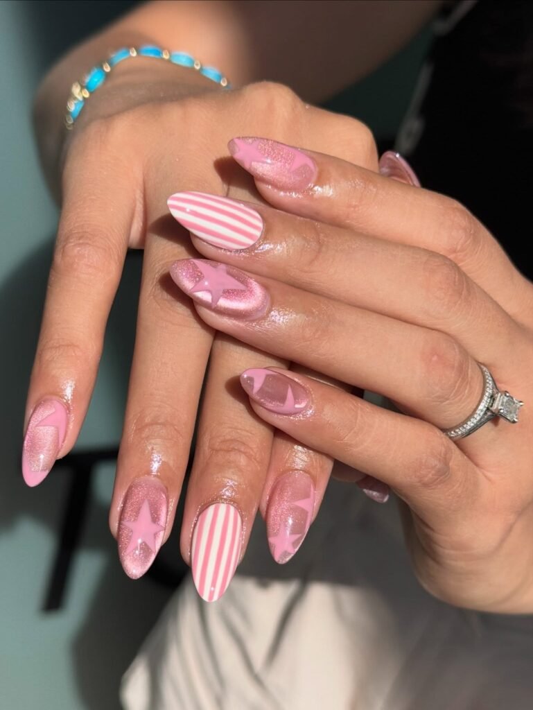 Pink star nails with glittery accents and striped details are made for fun spring energy. The mix of soft sparkle and bold patterns creates a playful set that still feels polished enough for everyday wear. If you want a manicure that looks cute in photos and stands out on Pinterest, this design is a perfect pick for the season ahead too.