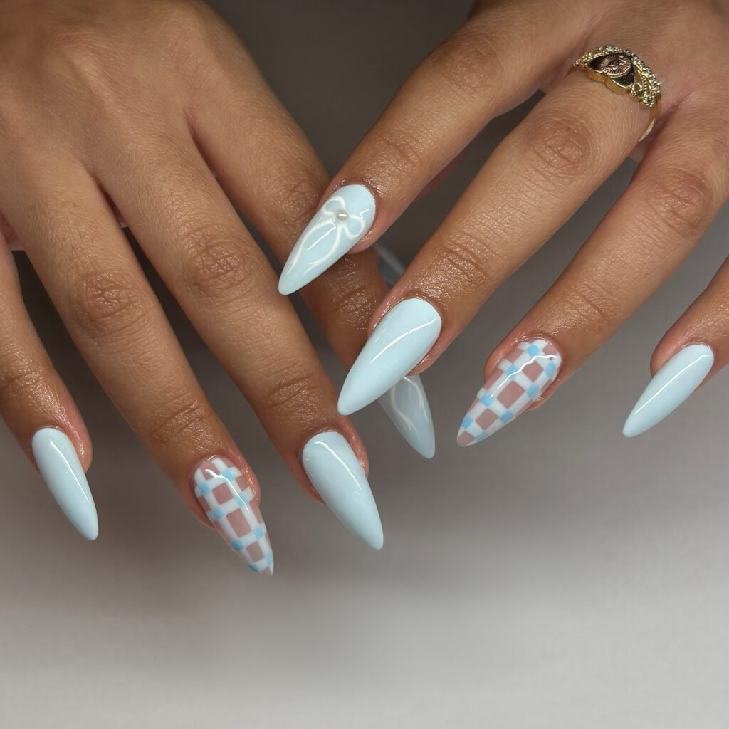 Soft sky blue nails paired with checkered accents and tiny bow details create the sweetest preppy spring mood. The long almond shape keeps the set elegant, while the pale color palette makes it feel airy and fresh. This is a lovely option if you want a manicure that looks feminine, trendy, and a little bit playful for any occasion and spring events.