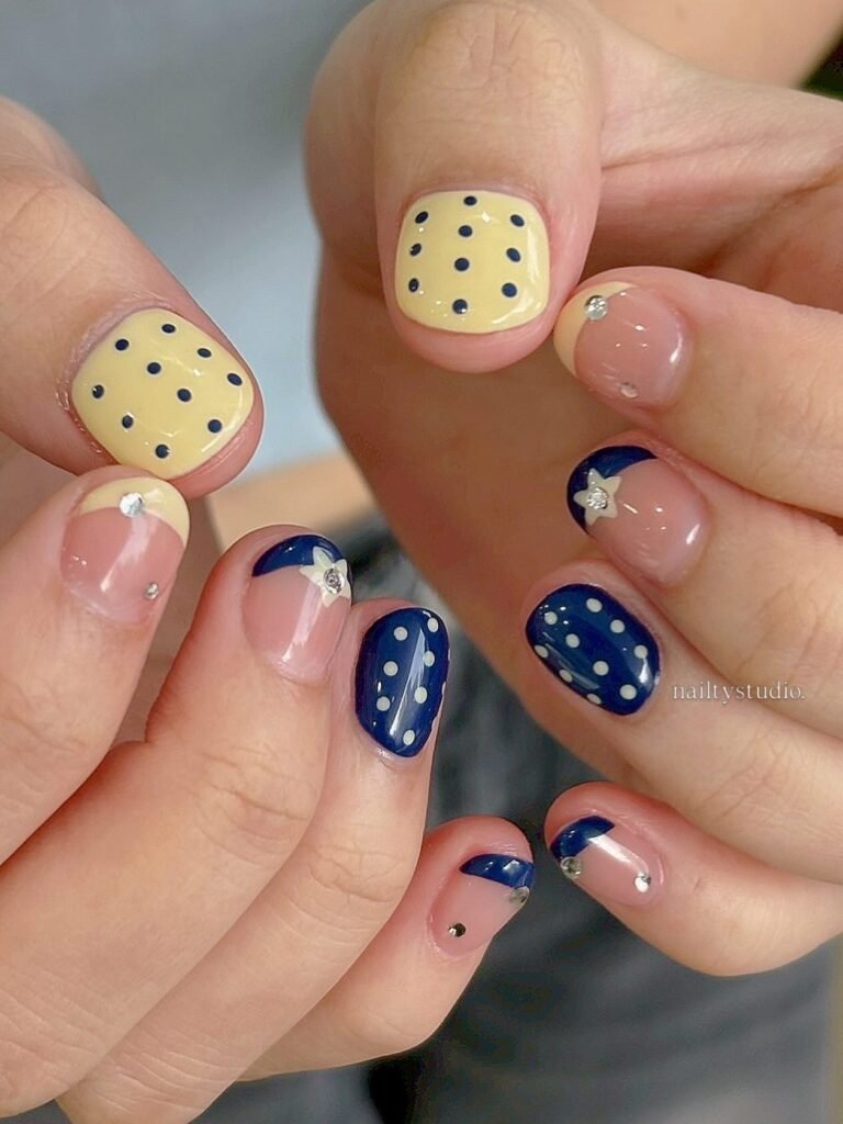 This playful pastel nail trend mixes soft yellow, deep navy, and delicate polka dots for a fresh, retro-inspired look. Tiny floral accents and glossy finishes keep the design cute and wearable, while the contrasting colors make it stand out on Pinterest. It’s a perfect option if you want pastel nails with a little personality and a modern twist for spring and summer.