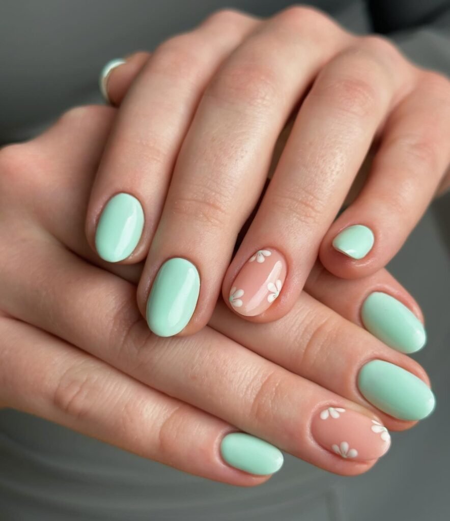 This mint and blush daisy manicure is soft, fresh, and easy to wear every day. The pastel green polish feels clean and calming, while the tiny floral details add just enough charm to keep it interesting. It’s a lovely pastel nail trend idea for short nails, especially if you want something cute, simple, and perfect for spring and summer too.