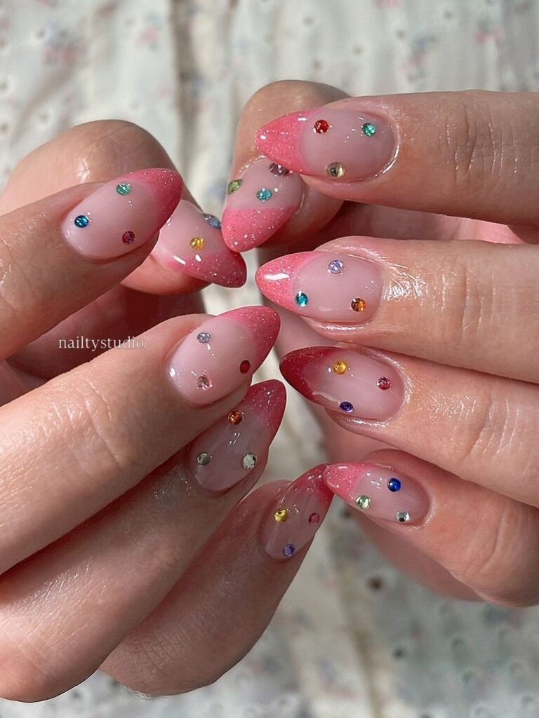 These glittery pastel pink almond nails are made for people who love a little sparkle. The glossy finish, jewel accents, and soft ombré effect create a pretty balance between glam and subtle. This pastel nail trend feels festive yet polished, making it ideal for parties, special occasions, or simply elevating your everyday manicure with a touch of shine and charm.