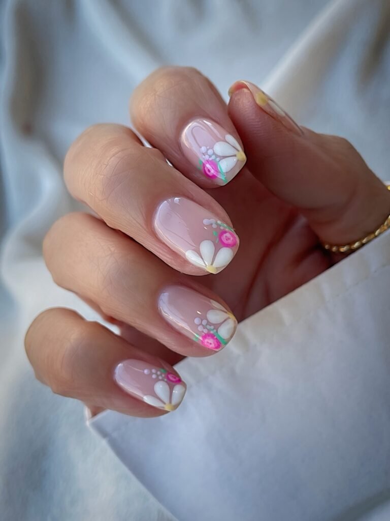 Green and pink floral nails bring a cottagecore feel to the pastel nail trend. The hand-painted daisies, ribbon accents, and delicate outlines make the design look artisanal and romantic, while the color pairing keeps it fresh and wearable. This style is ideal for Pinterest boards focused on spring nails, garden-party inspiration, or soft feminine beauty ideas throughout the season too.