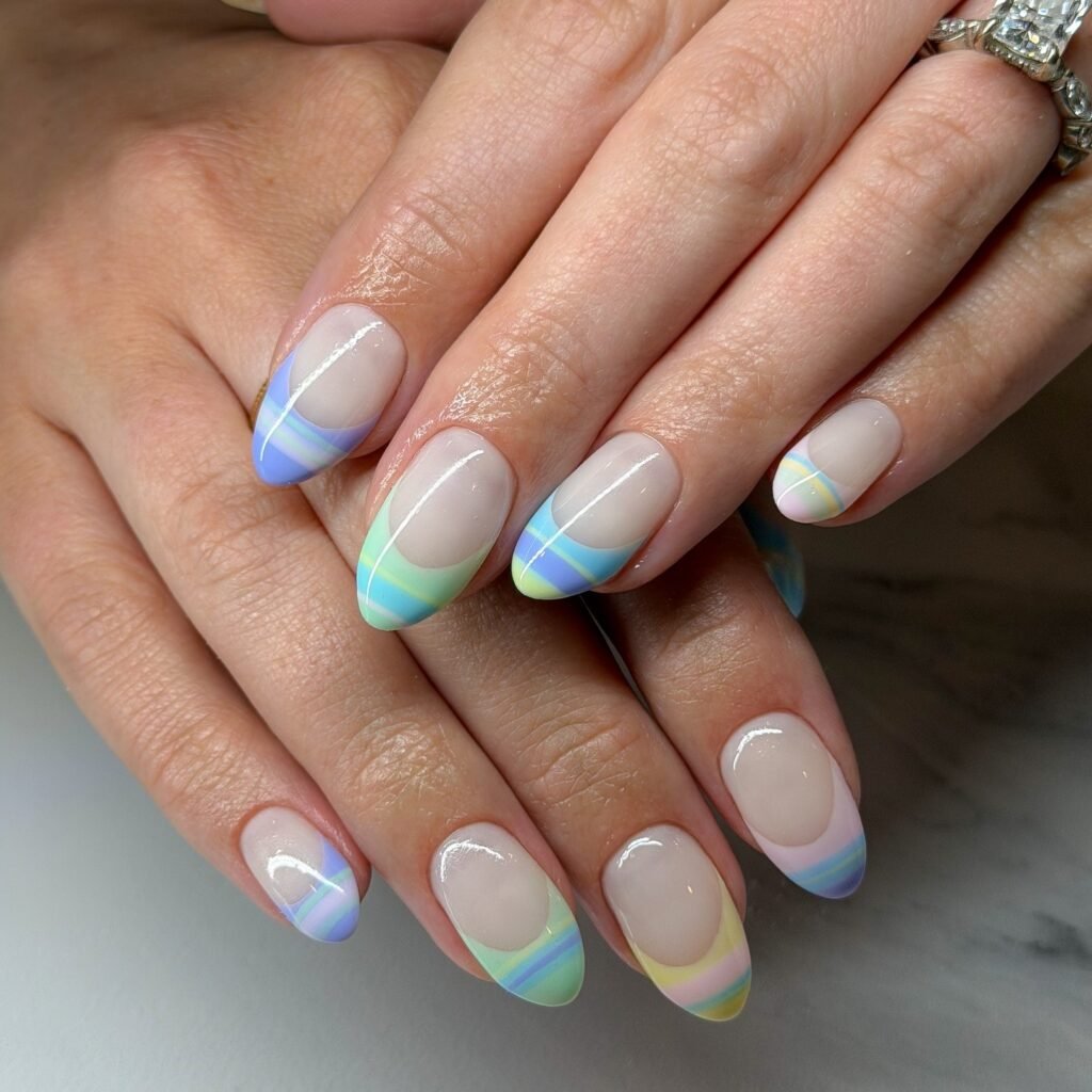 These pastel French tips feel clean, modern, and effortlessly cute. The sheer base keeps the manicure soft, while the icy blue, mint, and lilac edges add just enough color to follow the pastel nail trend without overpowering it. This look is perfect for short to medium nails and works especially well if you love minimal designs with a creative finish.