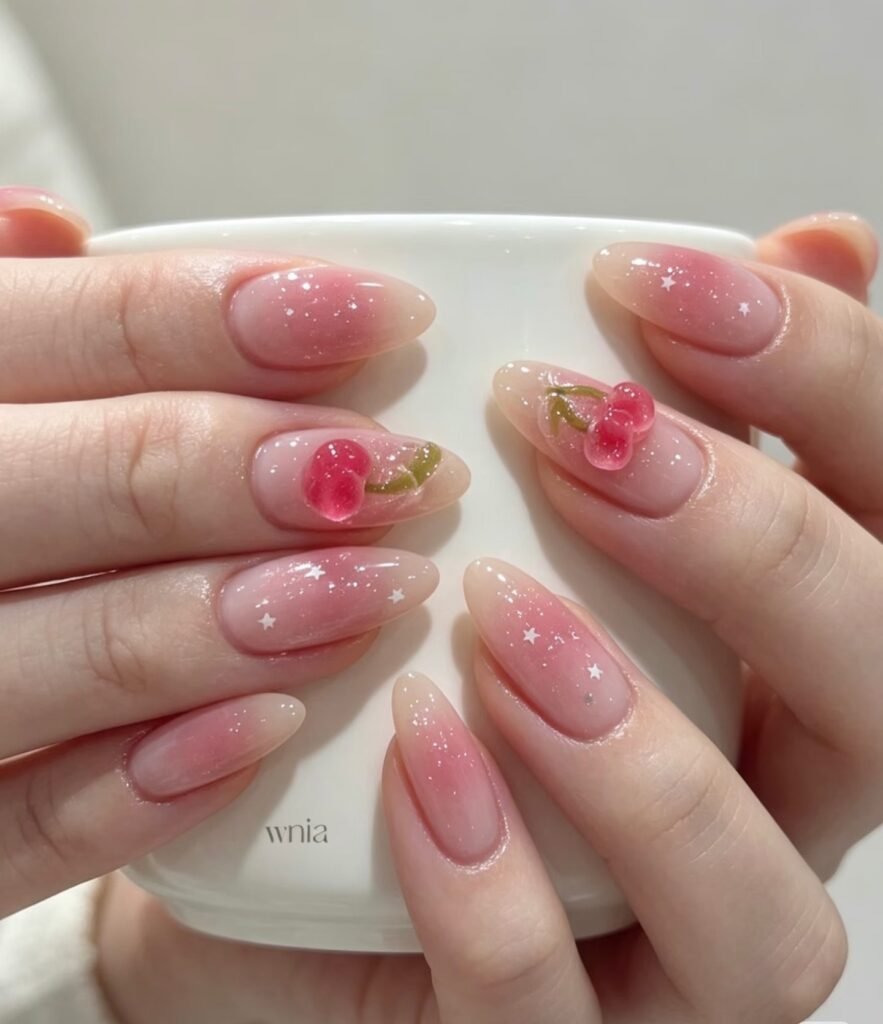 A cherry-inspired pastel manicure always feels fun, flirty, and very Pinterest-worthy. The soft pink base keeps the look delicate, while the 3D fruit details and tiny stars add a sweet, playful accent. This design is perfect if you want pastel nails that feel trendy, feminine, and just a little bit whimsical for spring or summer, and works beautifully for casual days.