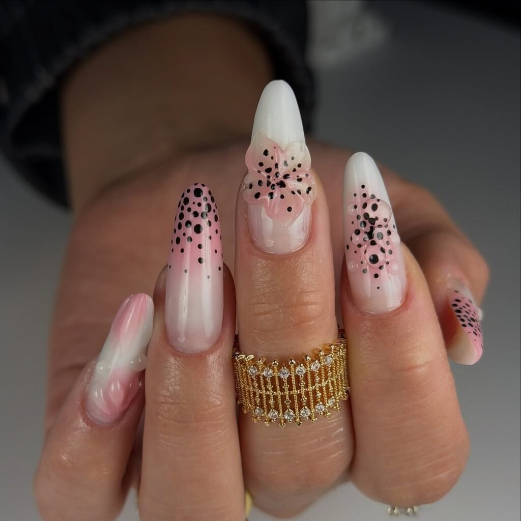 Pink and black floral nails create a bold yet feminine look that stands out instantly. The combination of soft pink tones with black dot detailing adds contrast and visual interest, while the floral elements keep the manicure pretty and stylish. This design is ideal for fashion-forward Pinterest boards, especially for readers who want something artistic, creative, and a little more eye-catching than a basic pink manicure.