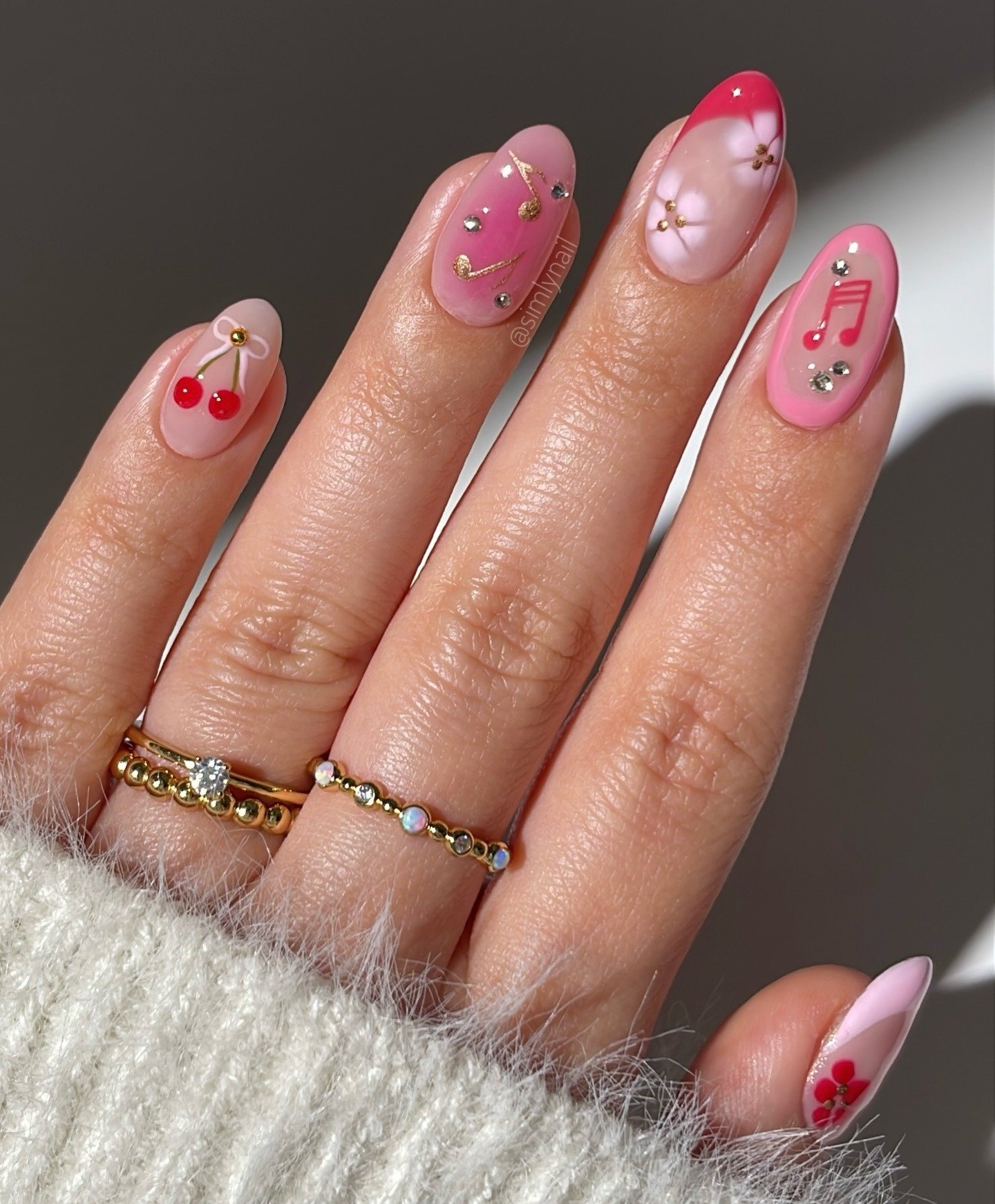 These cherry pink nail art ideas are playful, sweet, and perfect for Pinterest audiences who love fun details. The tiny cherry designs, music notes, and sparkly accents give the manicure a youthful, cheerful vibe. The pink base ties everything together and keeps the look feminine. This style is a great choice for spring and summer, especially for anyone who wants cute nails with personality.