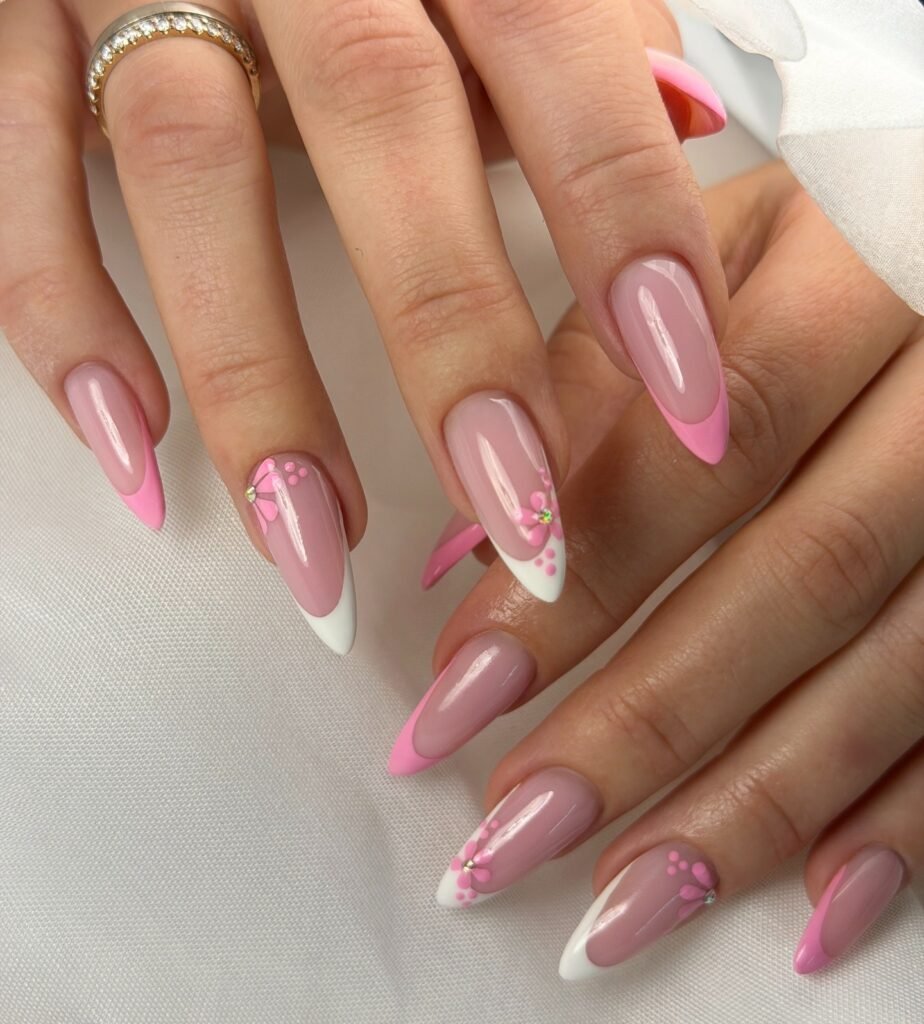 This pink French tip nail design is perfect for Pinterest users who love soft, feminine, and trendy manicure ideas. The blush pink base creates a clean and elegant look, while the bright pink tips add a playful pop of color. Delicate floral accents and tiny gems make the design feel romantic and polished, making it ideal for spring, date nights, weddings, or everyday pretty nail inspiration.