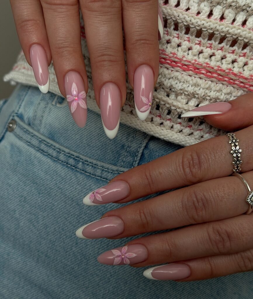 These floral French light pink nails are perfect for a soft and feminine Pinterest look. The blush pink base feels elegant and polished, while the white tips add a timeless French manicure effect. The delicate floral accents bring in a romantic, handcrafted touch that makes the design feel special. This style works beautifully for spring, weddings, date nights, or anyone who loves graceful nail inspiration.